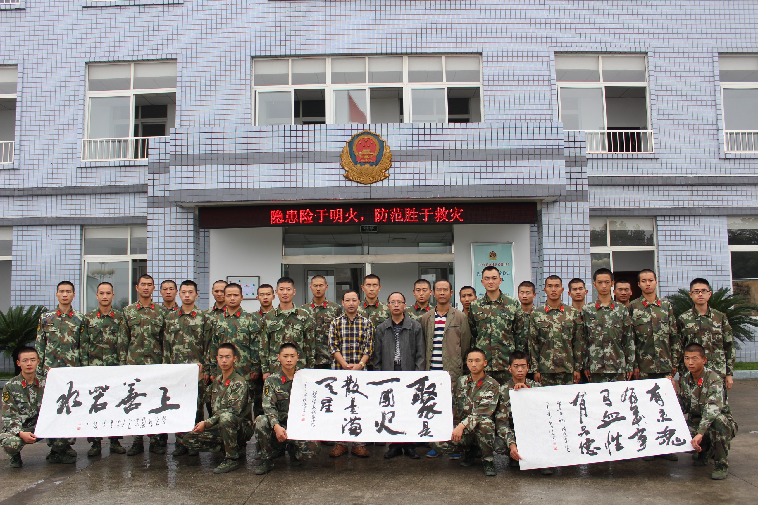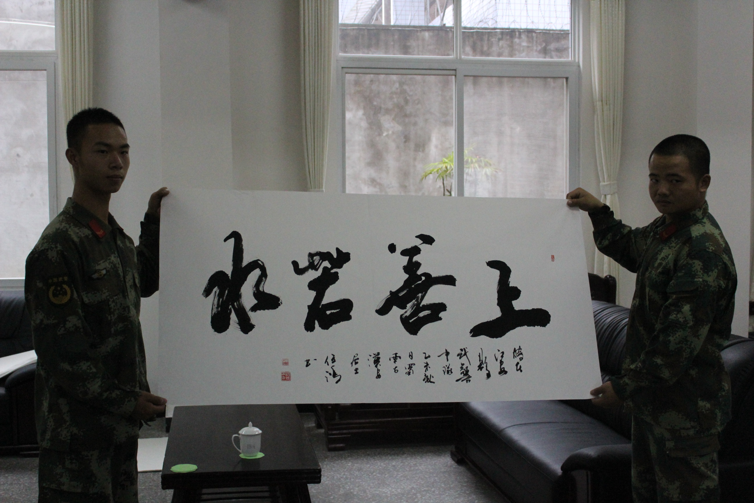在活动现场,经过认真的书写,一幅幅苍穹有力的书法作品逐渐交到退伍老兵手中,退伍老兵激动的说到:“在我们即将退伍之际,这是我们收到最珍贵的礼物,感谢你们的赠送,这是对我们最大的鼓励,我们会永远记得江安,我们曾经战斗过的地方”。县武警中队维护地方的和平和稳定,付出了巨大的努力,在退伍老兵即将离开之际,用书法寄托对武警官兵的情谊,正是体现了军民一家亲、军民鱼水情的特殊情谊。