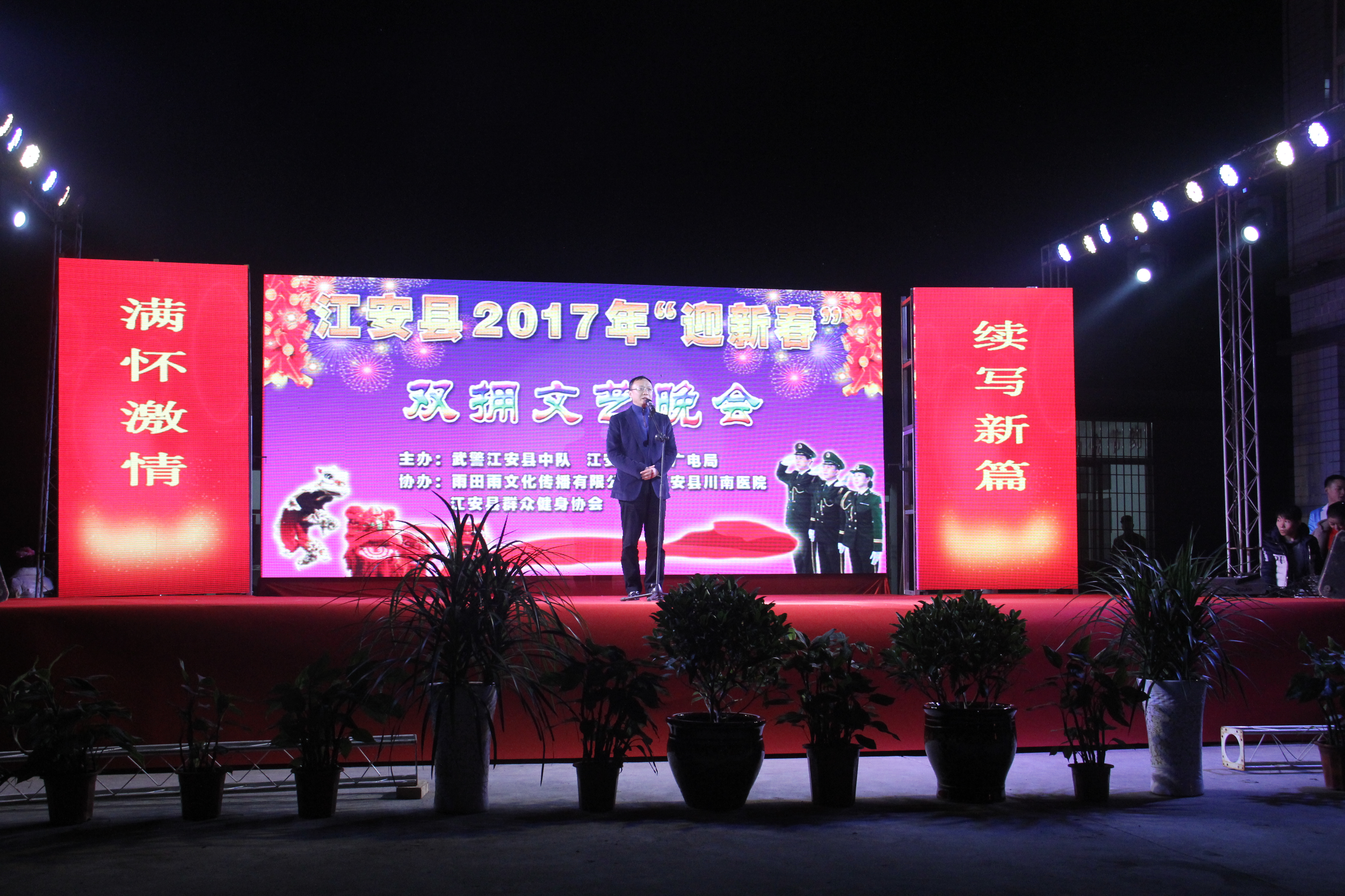 1月16日晚,由武警江安县中队、江安县文化广电局联合主办,“迎新春”双拥文艺晚会在县武警中队举行。县委书记张明明,武警宜宾市支队支队长聂刚,县长朱莉,副县长、公安局局长曾刚出席晚会,张明明书记致辞。