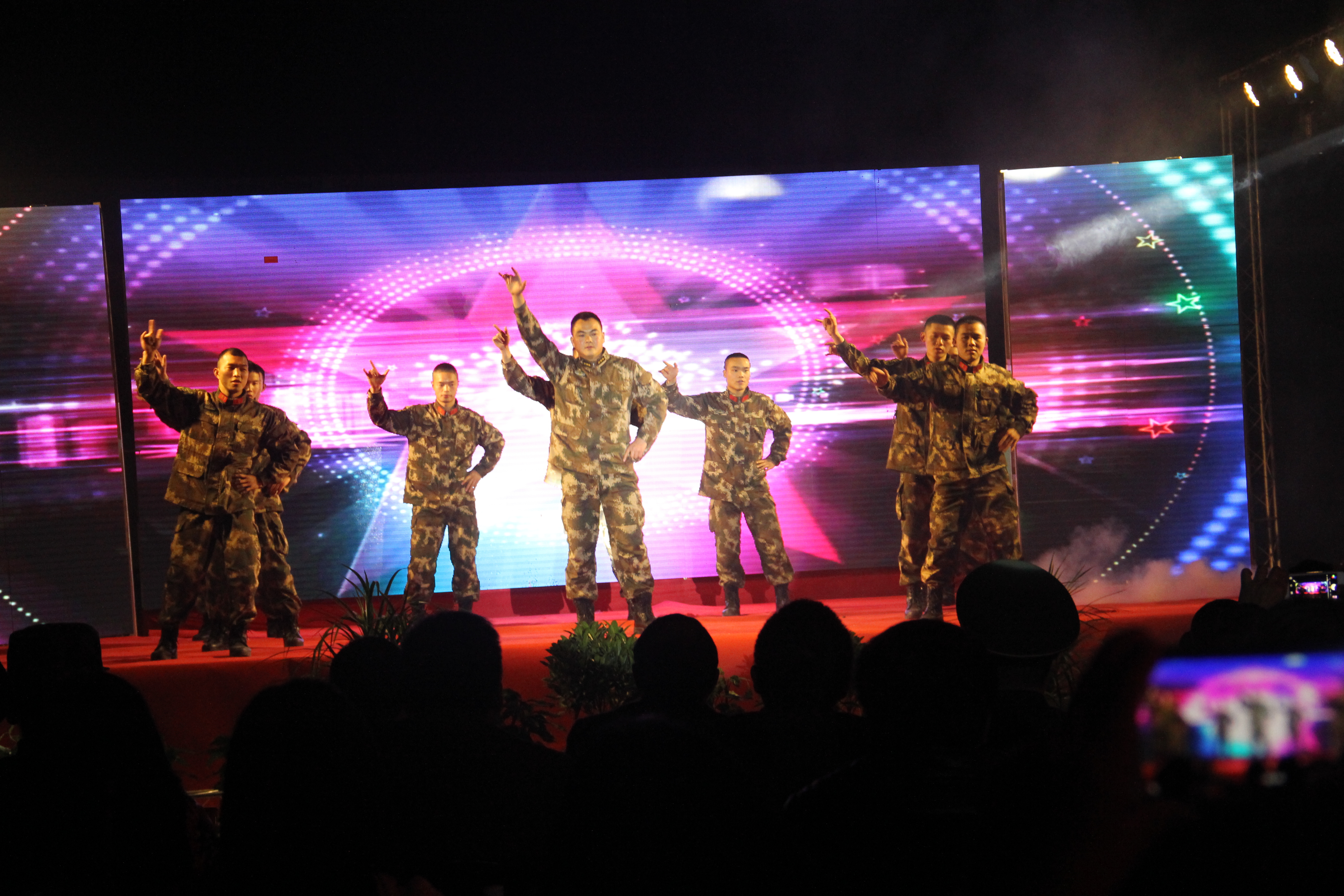 本场晚会精心准备,节目丰富多彩,文化馆和竹都艺术团带去了女生独唱,舞蹈《幸福江安城》、《花儿为什么这样红》;小品《门派之争》、小合唱《当兵前的那晚上》等展现了县武警中队官兵的军人风采。