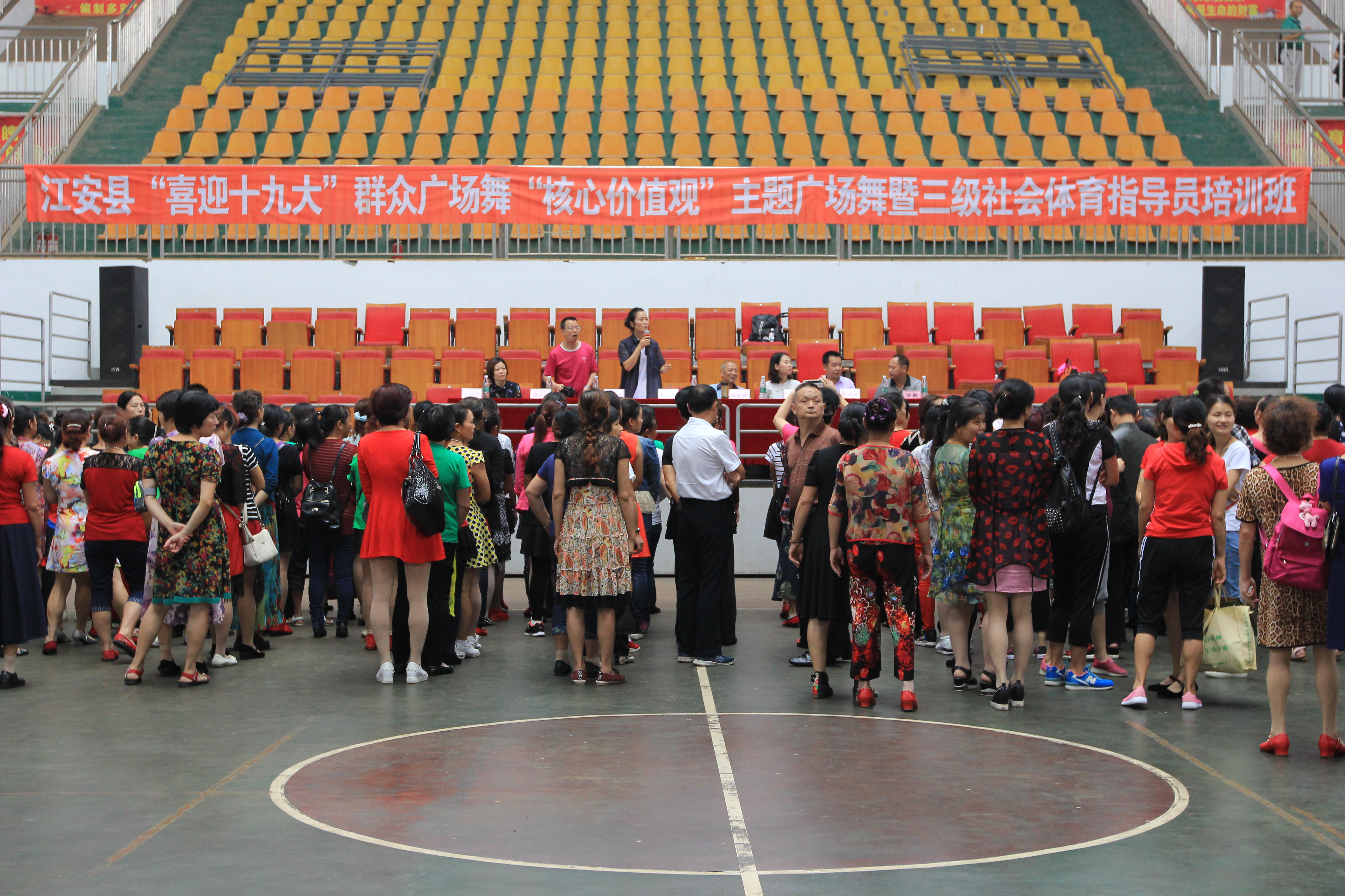 为不断满足人民群众的精神文化需求,壮大我县群众文体骨干队伍,为党的十九大胜利召开营造良好的文化氛围,2017年9月21日-22日,由中共江安县委宣传部、县体育局、县文化广电局和县老年人体育协会主办,县文化馆、县竹都艺术团承办,“喜迎十九大” 群众广场舞“核心价值观”主题广场舞暨三级社会指导员培训班在县体育馆隆重举行。