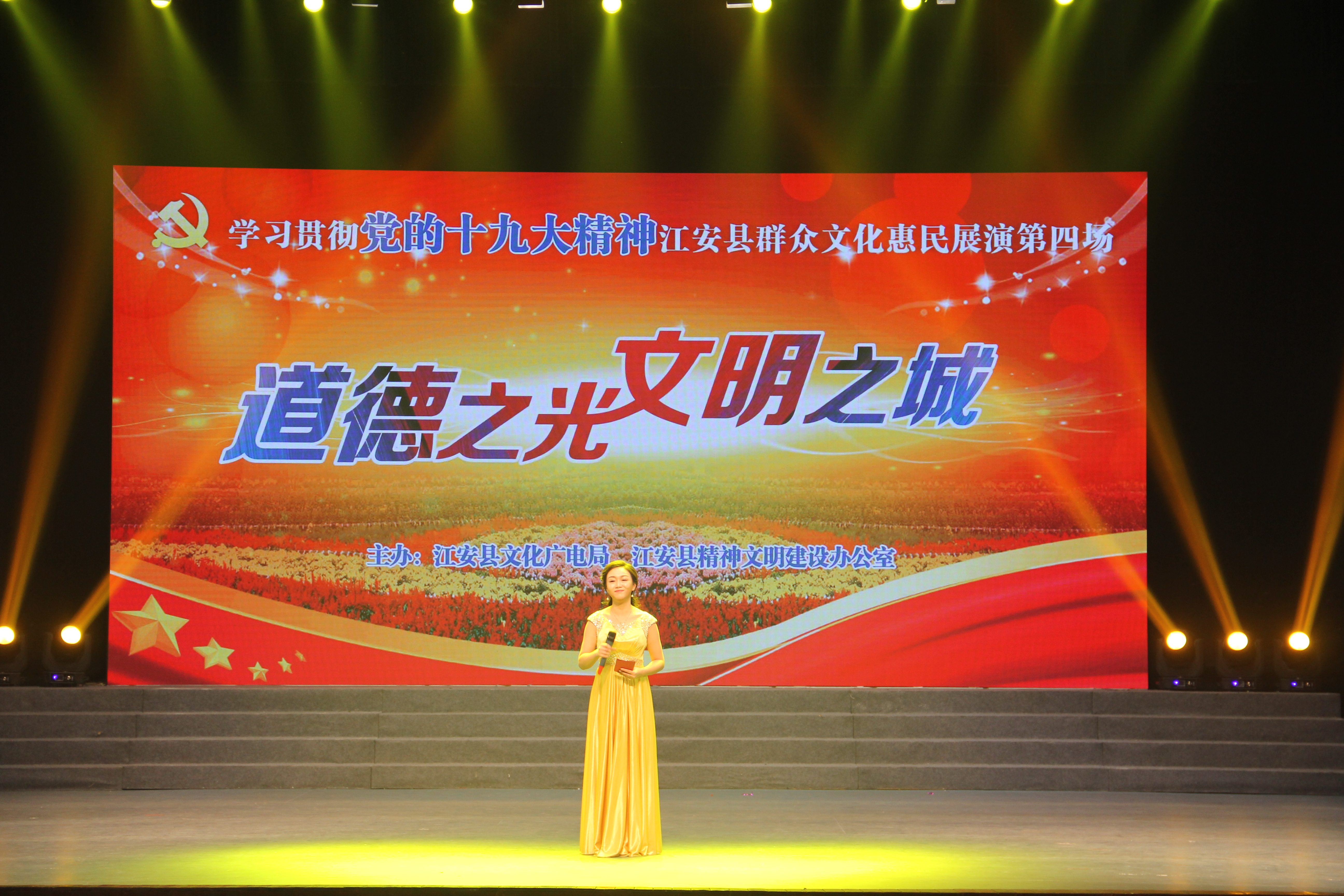 2017年11月29晚,由江安县文化广电局、江安县精神文明建设办公室主办的学习贯彻党的十九大精神“道德之光.文明之城”群众文化惠民展演第四场在江安剧场举行。