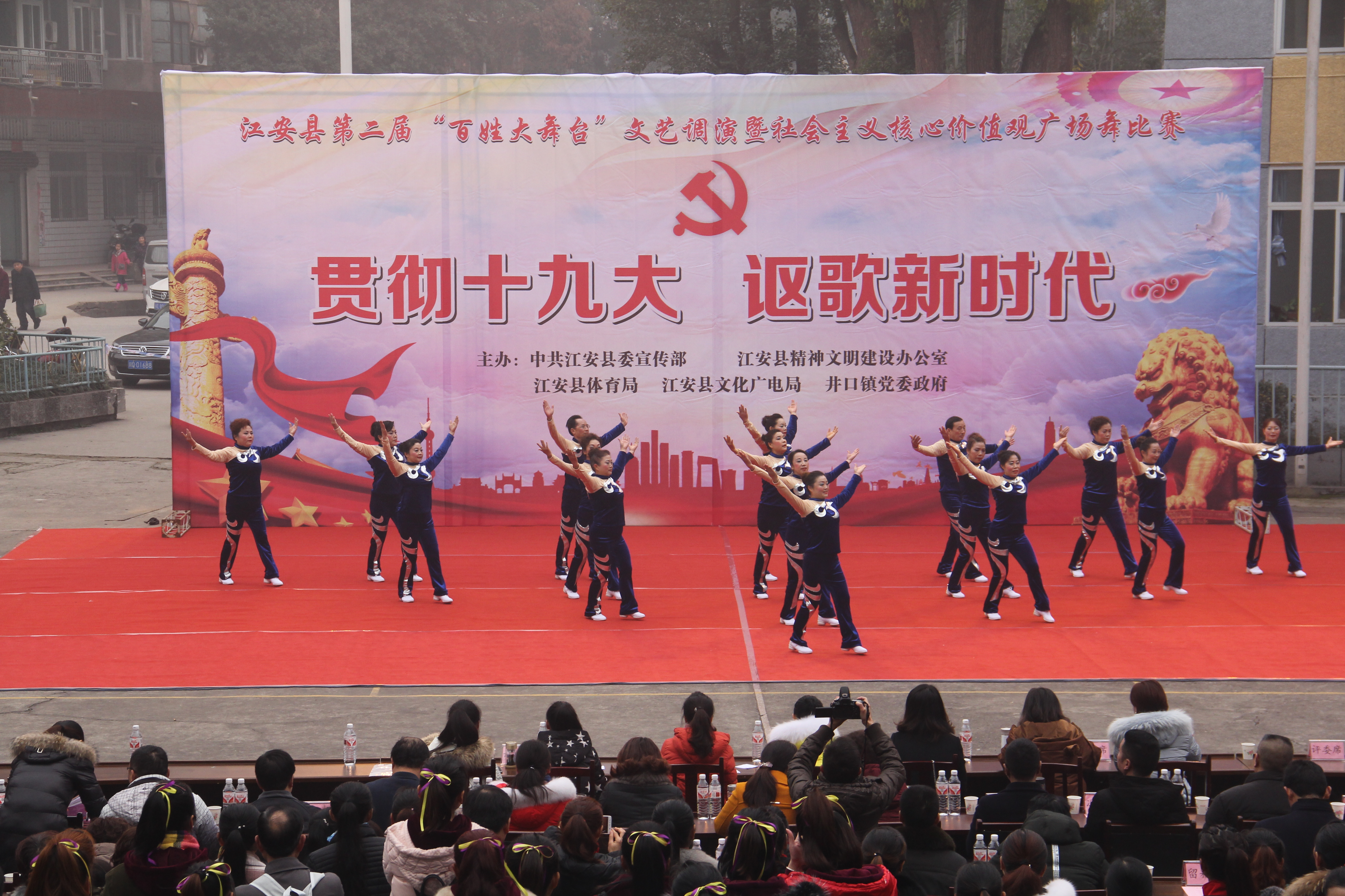 为深入贯彻宣传党的十九大精神,推进社会主义核心价值体系建设,繁荣和发展群众文化,展现江安群众精神风貌,营造政府搭台,百姓唱戏,城乡同乐的文化氛围,促进我县精神文明和文化事业发展,2017年12月27日,由中共江安县委宣传部、江安县精神文明建设办公室、江安县体育局、江安县文化广电局、井口镇党委政府主办,江安县文化馆、县竹都艺术团和县电视台协办,江安县第二届“百姓大舞台”文艺调演暨社会主义核心价值观广场舞比赛在井口镇隆重举行。