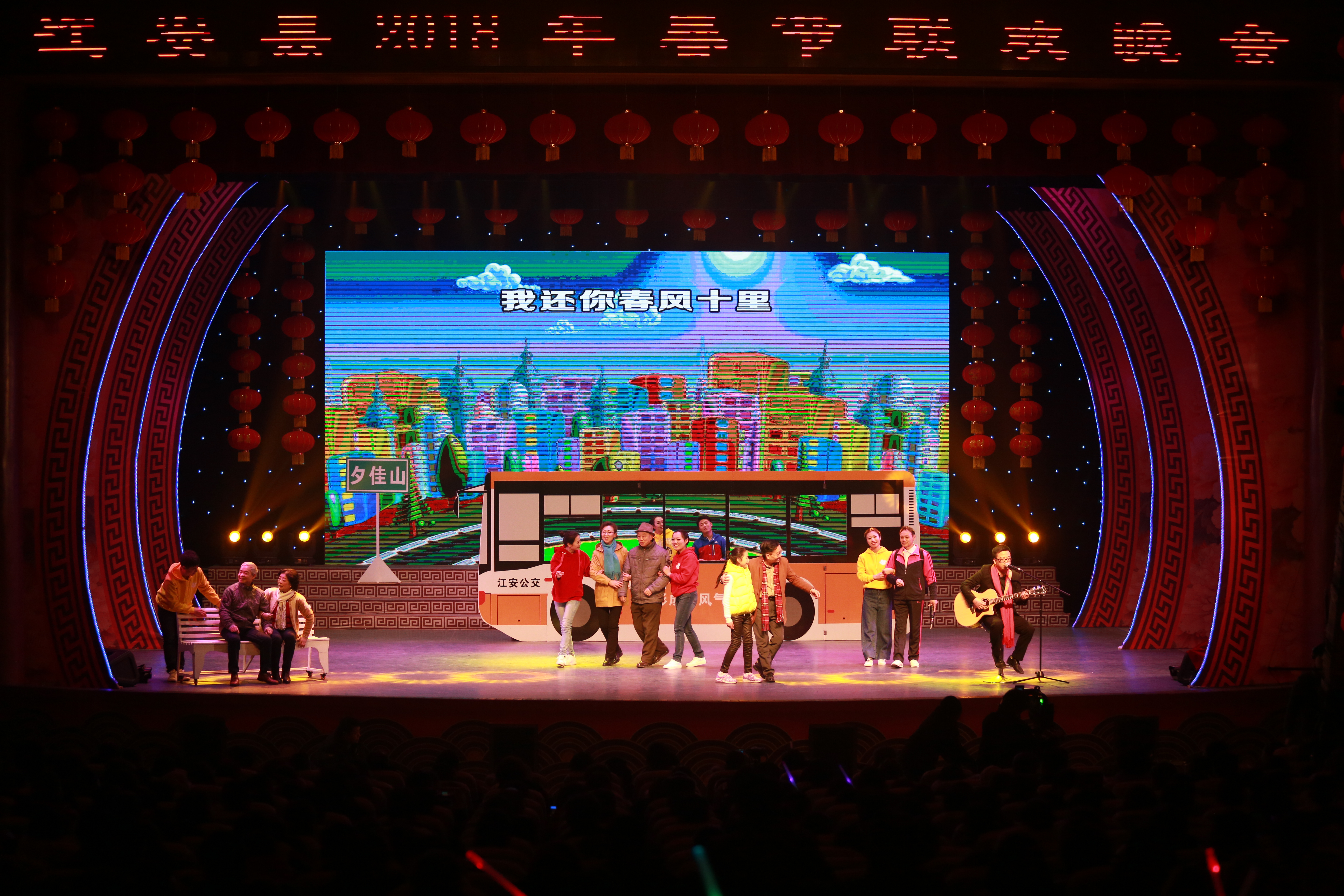 本次春节联欢晚会演出整容庞大,一共有400余人参与演出,晚会在舞蹈《美丽中国年》拉开序幕。晚会共分为了《不忘初心砥砺前行》、《几声修的住江安》和《团团圆圆过新年》,县四家班子领导带队演出大合唱《不忘初心》和《我的家乡在江安》,紧接着便是一系列精彩节目,小品、戏曲联唱、音乐情景剧、歌曲串烧、群舞等等,给全县群众奉献了一场精彩的视觉盛宴,剧场座无虚席。