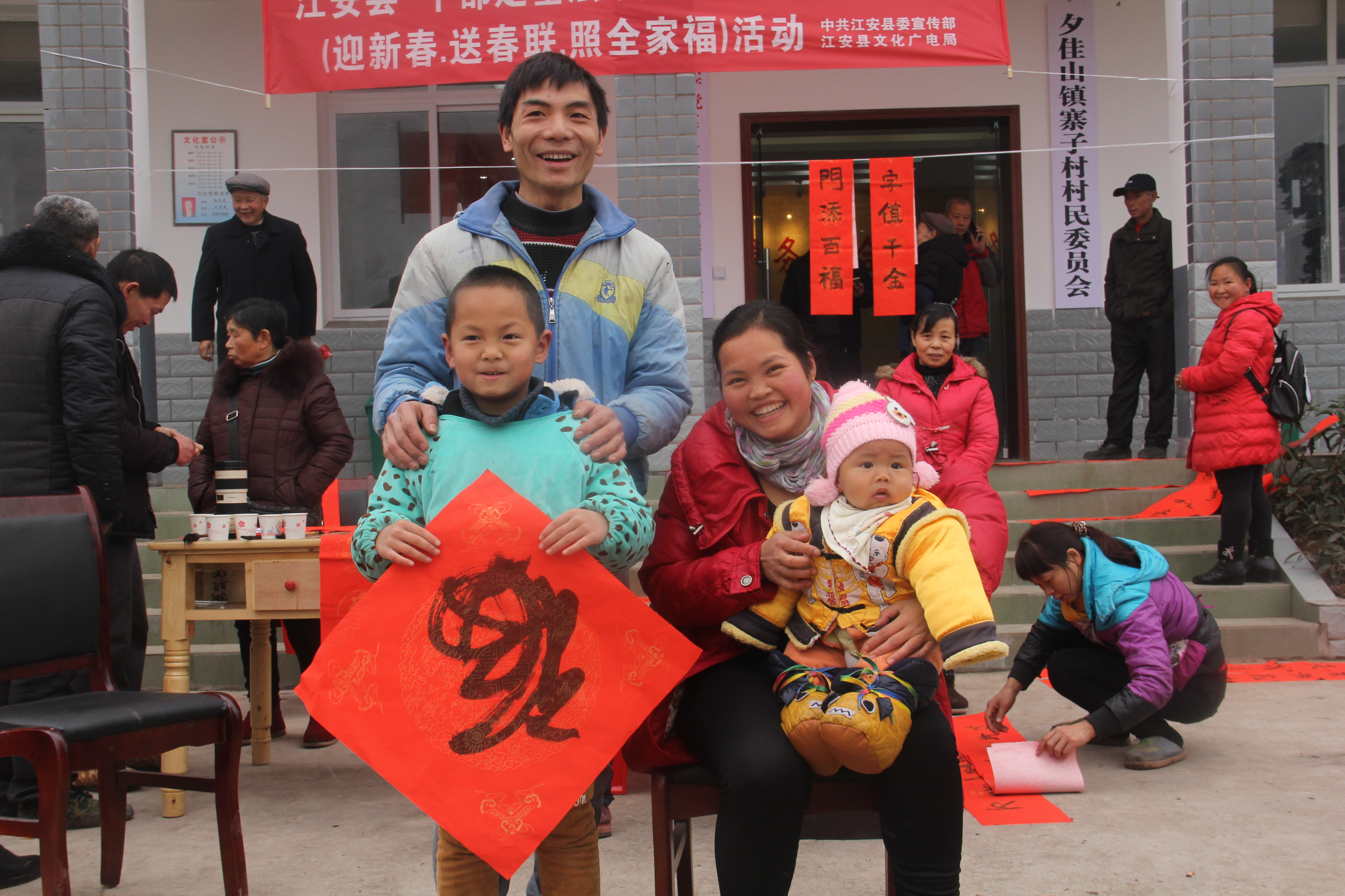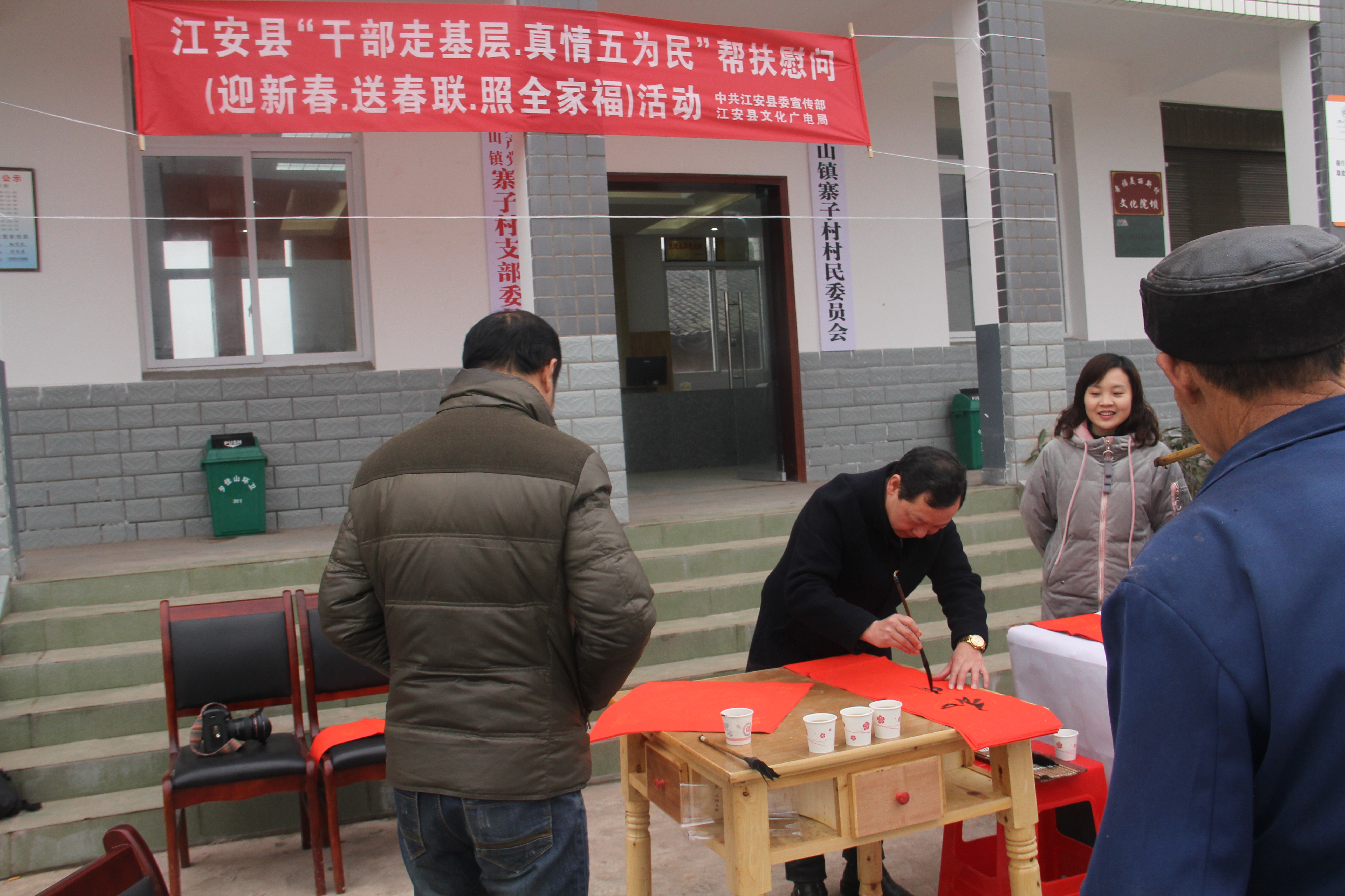正值新春佳节来临之际,2018年2月9日,由中共江安县委宣传部和江安县文化广电局联合主办,县文化馆承办的“干部走基层.真情五为民”帮扶慰问活动在省级贫困村夕佳山镇寨子村开展,此次活动主要通过现场书写春联和照全家福的方式,给寨子村的群众送去新春佳节的美好祝愿,现场群众络绎不绝,都对此次活动赞不绝口。