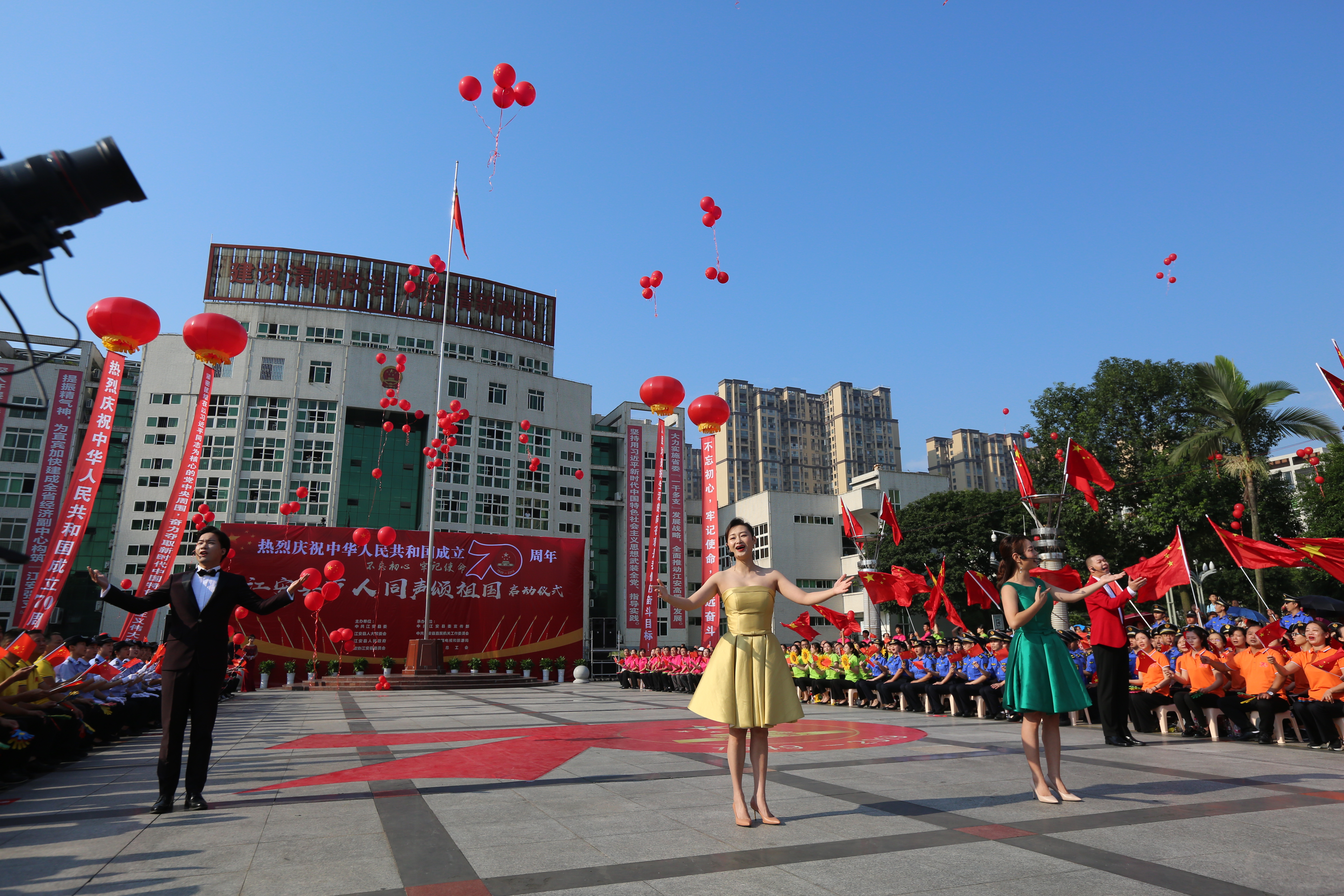 9月23日,由中共江安县委、江安县人大常委会、江安县人民政府、政协江安县委员会主办的“万人同声颂祖国”歌咏活动在江安县竹都广场拉开序幕。全县所有领导参与的县直机关工委代表队,以及江安县文化广播电视和旅游局、江安县公安局、江安县教体局等14支代表队参与歌咏活动,他们以拉歌的方式唱出心中对祖国的无比热爱。