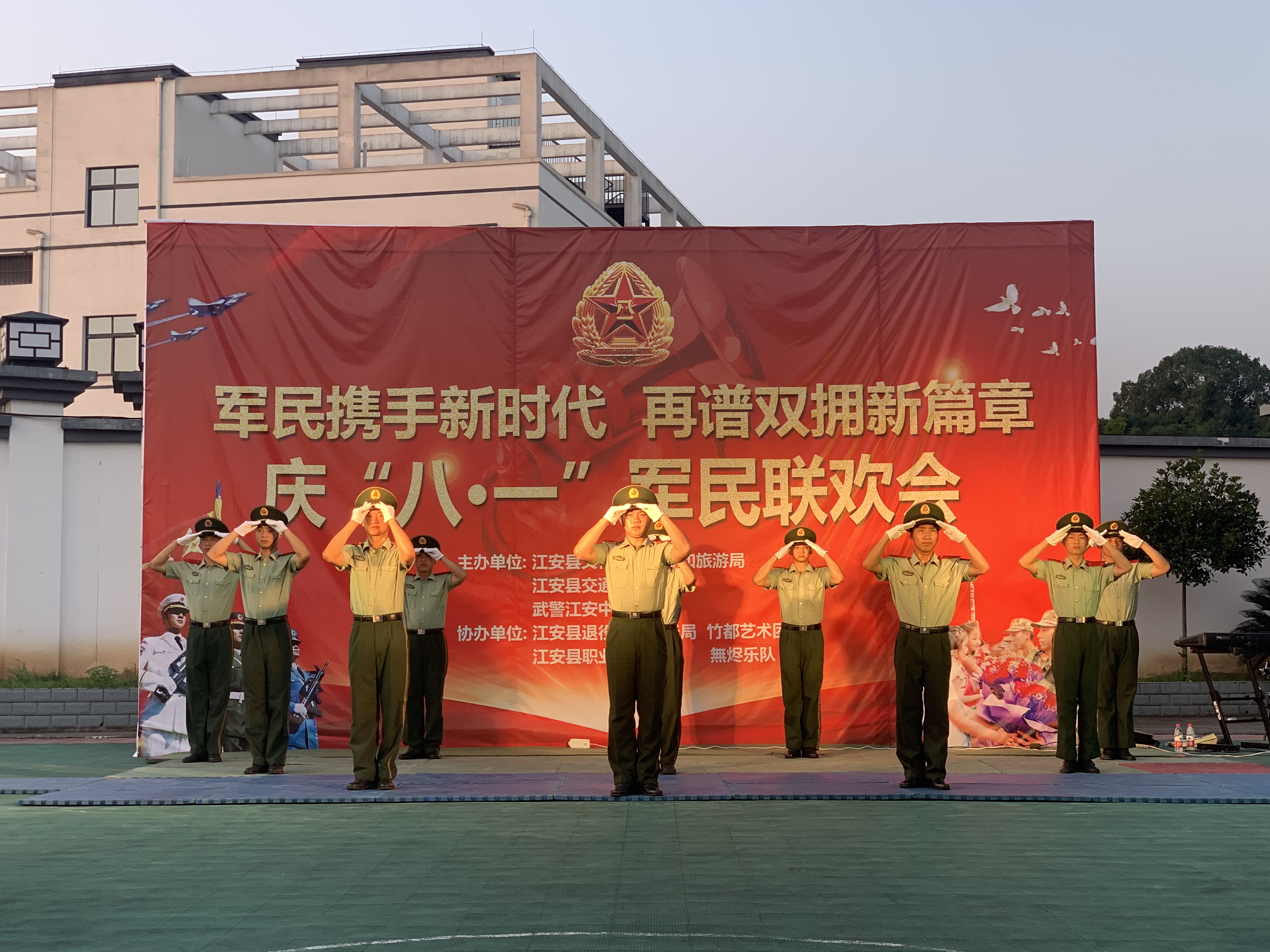 8月1日,由江安县文化广播电视和旅游局、江安县交通运输局、武警江安中队主办,江安县退役军人事务局、竹都艺术团、江安县职业技术学校协办的“军民携手新时代 再谱双拥新篇章”庆“八一”军民联欢会,在县武警中队举行。军地领导、部队官兵等200余人齐聚一堂,共享文化大餐。