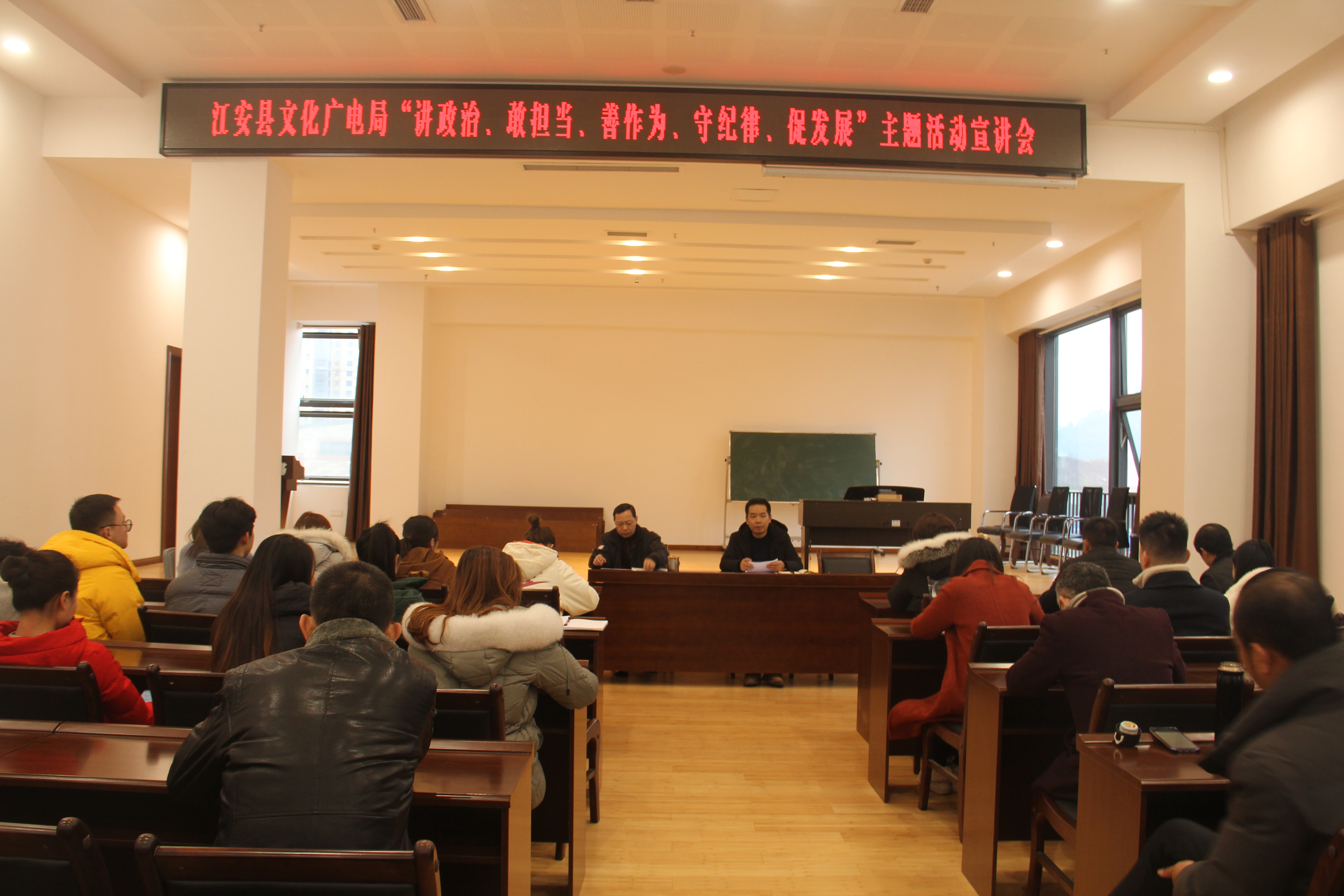 2019年1月21日下午五点,文化广电局党委委员、纪委书记刘明松在文化馆多功能厅主持“讲政治、敢担当、善作为、守纪律、促发展”主题宣讲会,局文化股、江安剧场和县文化馆、图书馆、竹都艺术团全体职工参加。